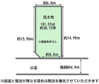 | 現況古家あり | 引渡し相談 | | 取引態様専属専任媒介 | 土地面積101.57m2 | | 地目宅地 | 都市計画市街化区域 | | 用途地域第一種住居地域 | 建ぺい率60% | | 容積率200% | 土地権利所有権 | | 国土法届出不要 |
